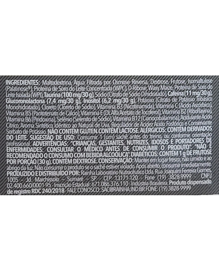 Maltodextrina, Água Filtrada por Osmose Reversa, Dextrose, Frutose, Palatinose (Isolmaltulose), Whey Protein Concentrada (WPC), D-Ribose, Waxy Maize, Whey Protein Isolada (WPI), Taurina (96mg/30g), Citrato de Sódio Dihidratado, Cafeína (11mg/30g),Glucoronolactona (7,2mg/30g), Inositol (6,0mg/30g), Potássio (Citrato de Potássio Tribásico Monohidratado), Cloretos (Cloreto de Sódio), Vitamina B3 (Nicotinamida), Vitamina C (Ácido Ascórbico), Vitamina B5 (Pantotenato de Cálcio), Vitamina E (DL Alfa Acetato de Tocoferol), Vitamina B2 (Riboflavina), Vitamina B6 (Piridoxina), Selênio (Selenito de Sódio), Vitamina B12 (Cianocobalamina), Acidulante Ácido Cítrico, Regulador de Acidez Ácido Fosfórico, Conservante Sorbato de Potássio. Abacaxi: Aroma Idêntico ao Natural de Abacaxi. Frutas Vermelhas: Aroma Idêntico ao Natural de Frutas Vermelhas. Guaraná com Açaí: Aroma Idêntico ao Natural de Guaraná com Açaí. Limonada: Aroma Idêntico ao Natural de Limão. Morango Silvestre: Aroma Idêntico ao Natural de Morango. Uva Verde: Aroma Idêntico ao Natural de Uva Verde. ALÉRGICOS: CONTÉM DERIVADOS DO LEITE.NÃO CONTÉM GLÚTEN.