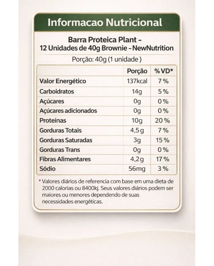 Barra proteica de origem vegetal, formulada com proteina concentrada de ervilha e proteina concentrada de arroz. Cada unidade possui 40g e entrega proteina e fibras para apoiar sua alimentacao no dia a dia.