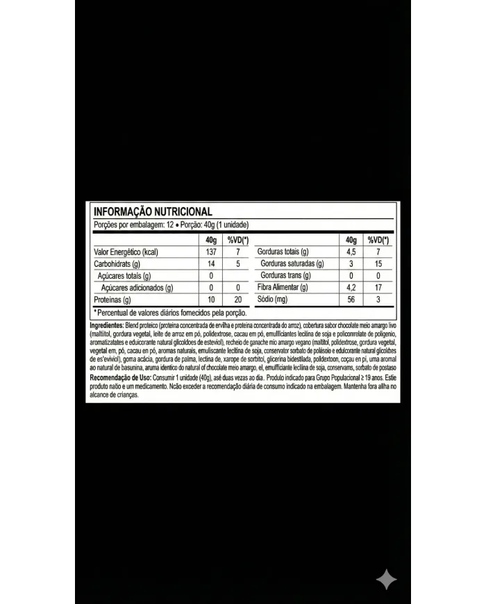 - Cobertura sabor chocolate meio amargo vegano responsavel pelo sabor equilibrado, sem ingredientes de origem animal.
