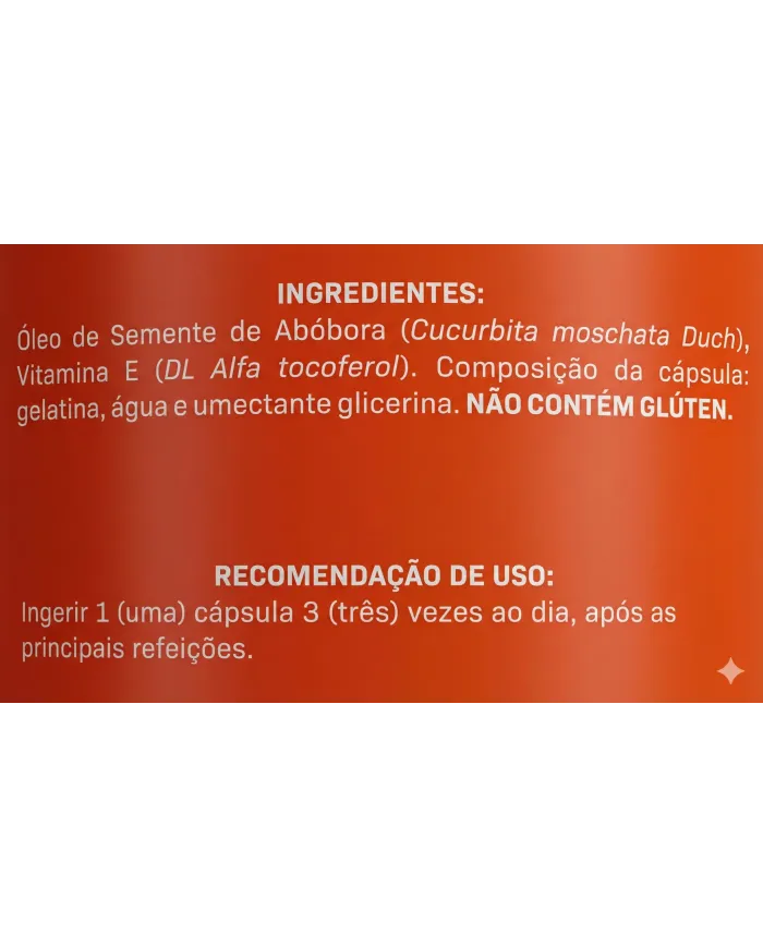 Óleo de Semente de Abóbora, Vitamina E (DL Alfa Tocoferol), cápsula de gelatina, água e glicerina. Não contém glúten.