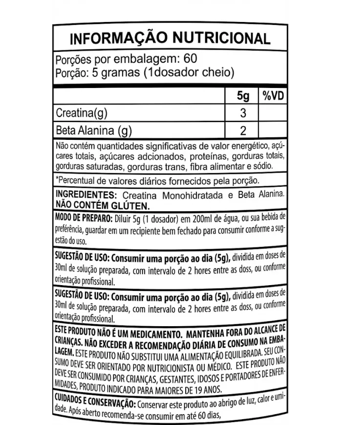- Beta Alanina – 2g por dose: reduz a fadiga, aumenta a resistência e melhora o desempenho em treinos intensos.