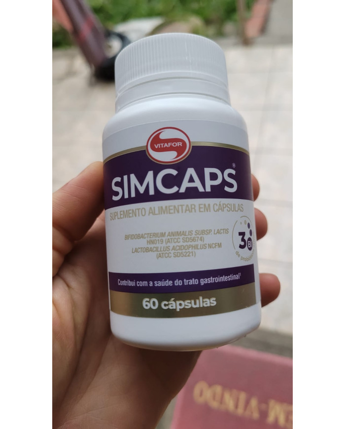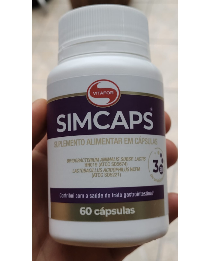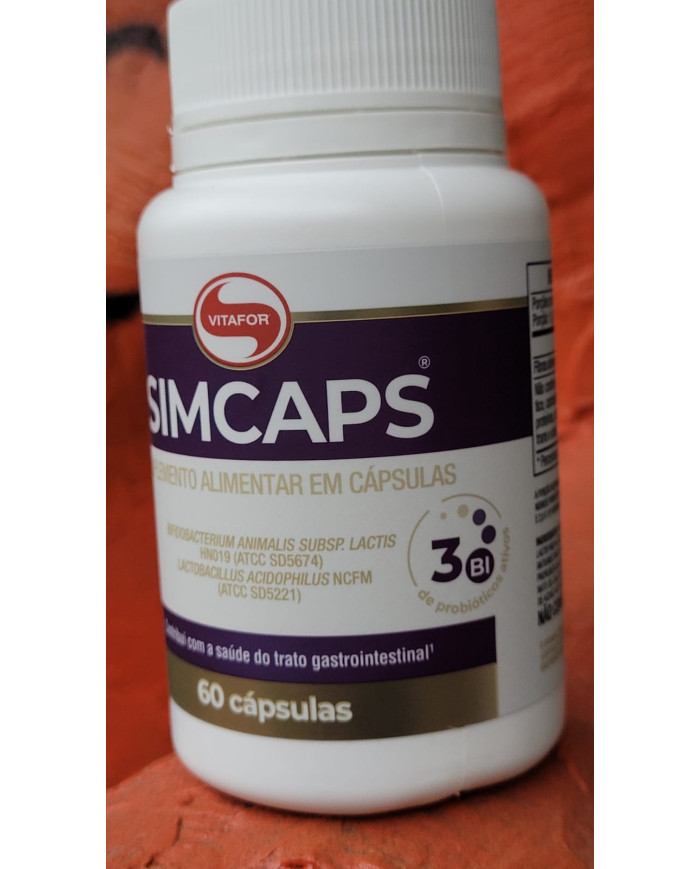 O Simcaps da Vitafor é um suplemento alimentar em cápsulas formulado com 2 cepas probióticas premium: Bifidobacterium animalis subsp. lactis HN019 e Lactobacillus acidophilus NCFM. Cada porção contém 3 bilhões de microrganismos vivos, que auxiliam no equilíbrio da microbiota intestinal e contribuem para uma digestão mais saudável.