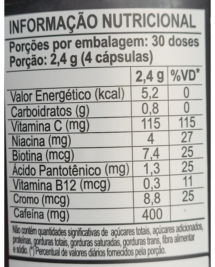 Cafeína Anidra, Picolinato de Cromo, Vitaminas do Complexo B, Magnésio, e outros ativos com ação estimulante e antioxidante.